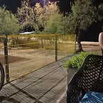 Az önellátó felszerelések között szerepel a konyha mosogatógéppel. A vendégek pihenhetnek a teraszon.